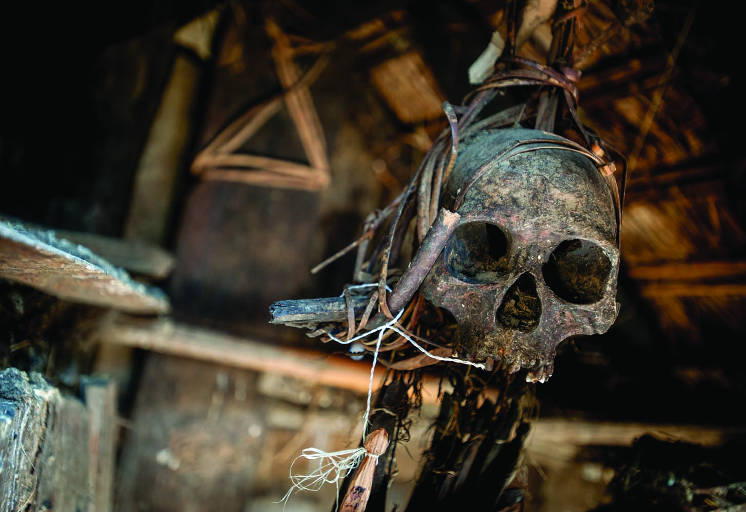 Legend has it that the skull hanging in the hut behind the chief of Pansar’s house once belonged to a Koki warrior. Despite its unimpressive setting, the chief said that the skull still has the power to cause trouble for anyone who disrespects it. Photo by Elliott D. Woods.